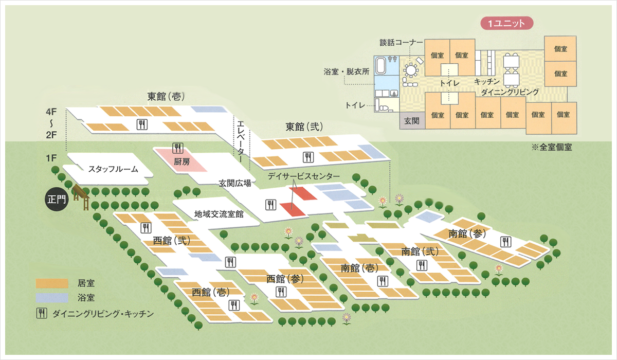 | 東館(4階建て) | (2F)東2-1、東2-2 計4ユニット (3F)東3-1、東3-2 |